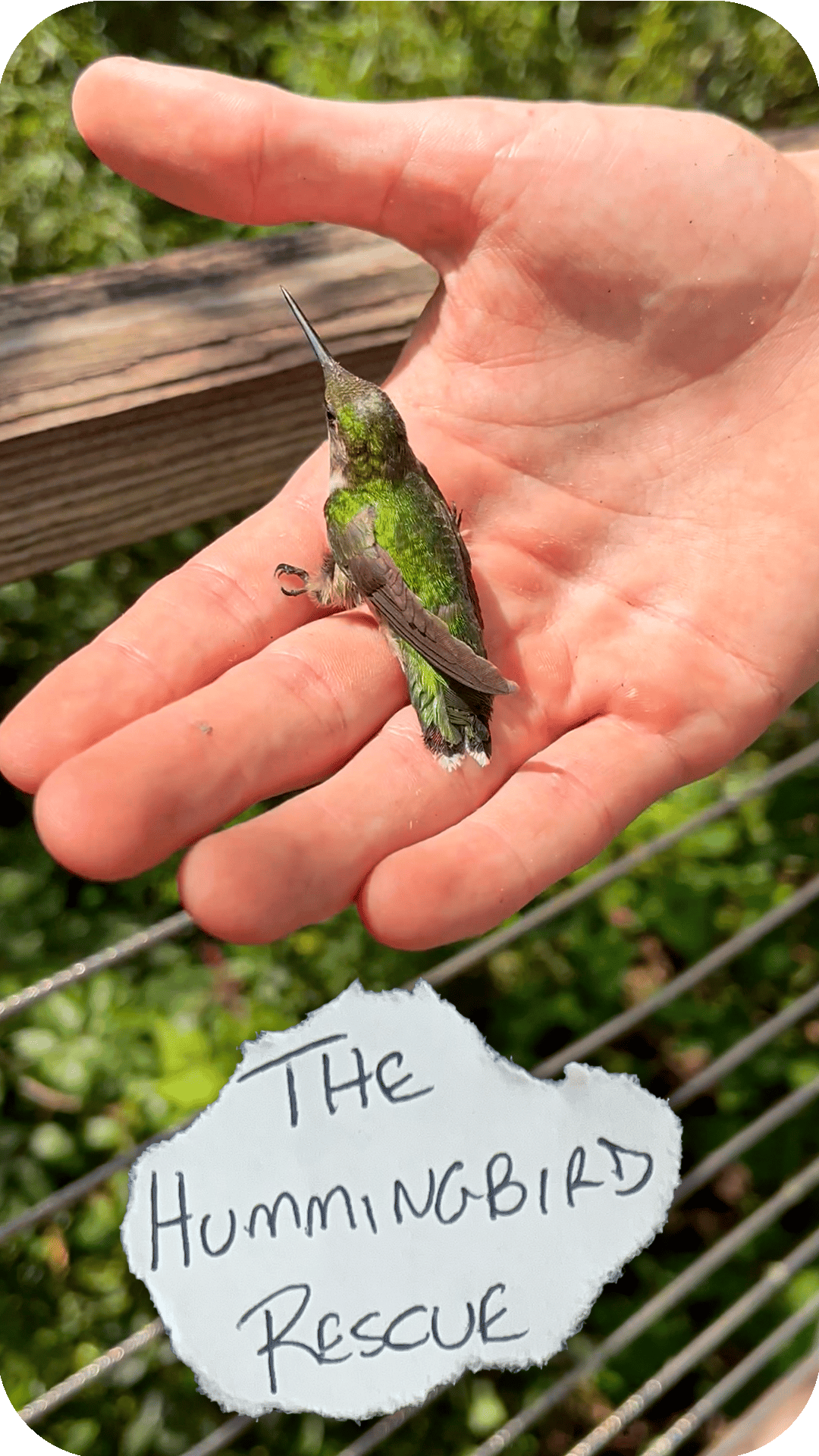 After finally being worn out from the energy-intensive evading, the Hummer stopped to rest on the frame of the net, to which I swiftly lowered the Hummingbird Catcher 3000 & our “caught” hummingbird down towards the ground with Matt’s guidance. As the Hummer came within arm reach, I extended my arm then hand and slowly covered her, making sure she wouldn’t evade rescue again. We brought the net & our new friend down to the ground, pried off her toes from gripping the net, and began feeding her sugar water.
